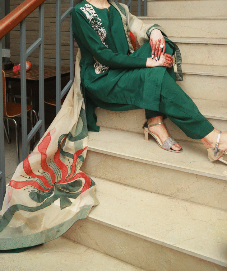 Unveil timeless elegance with Emerald Bloom, a three-piece ensemble that captures the perfect harmony between traditional artistry and modern sophistication. Rendered in a rich deep emerald green, this set is crafted from luxurious raw silk, offering a naturally textured finish and graceful drape that enhances its regal appeal.