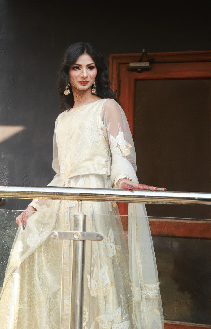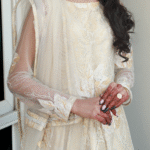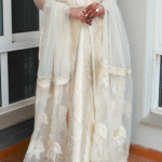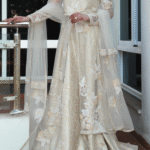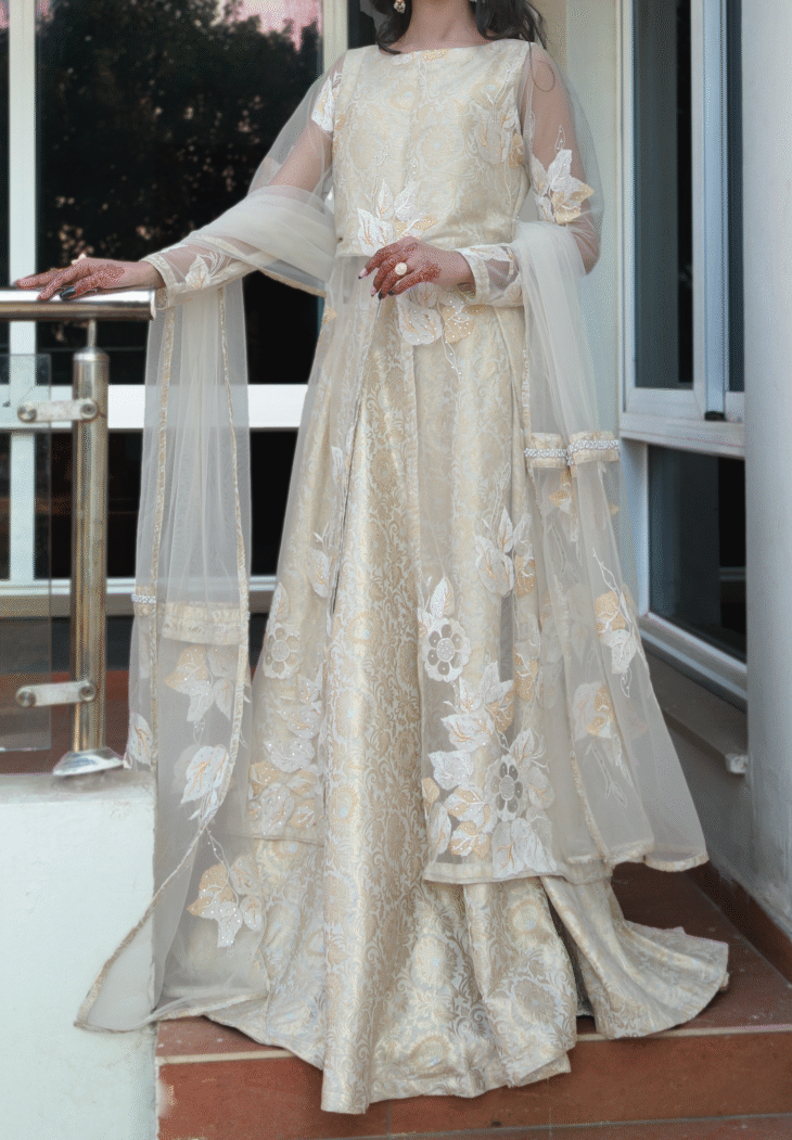 The attached net sleeves seamlessly blend into the shirt, delicately embroidered with floral patterns and embellished with fine stonework, offering a subtle sparkle that catches the light with every movement. Completing the ensemble is a flowing net dupatta, adorned with matching embroidery and shimmering stone accents along the borders and throughout the fabric, adding the perfect finishing touch of opulence.
