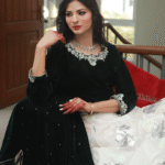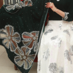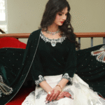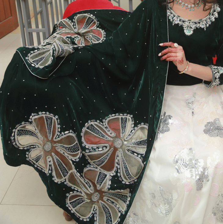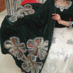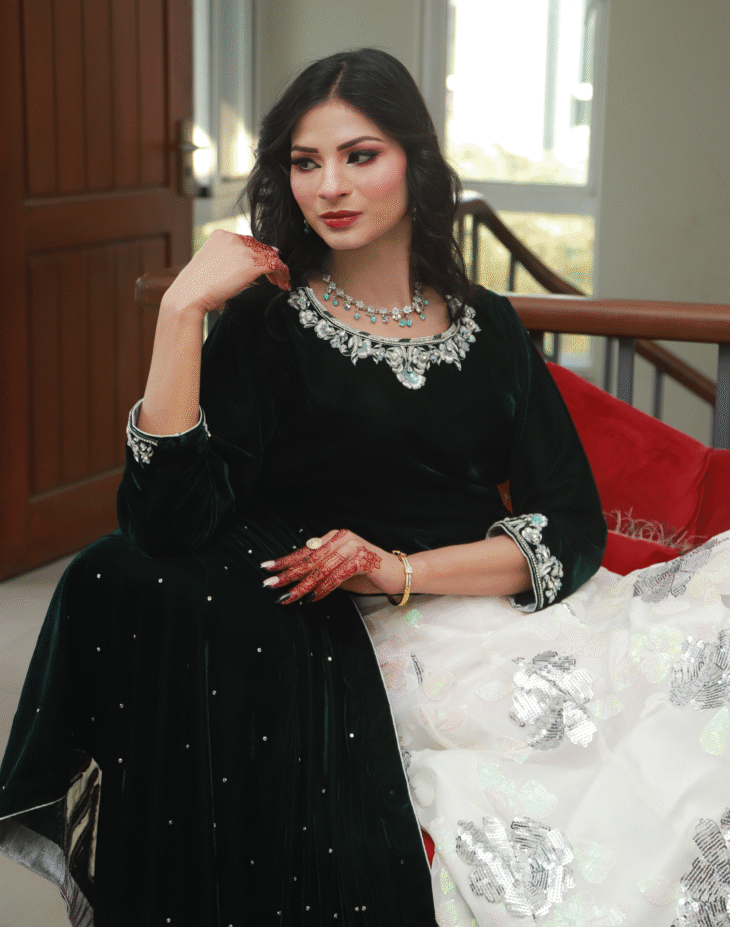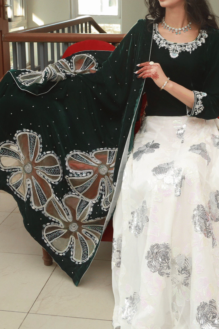 Embrace regal sophistication with this stunning three-piece ensemble, crafted to make a lasting impression. The kurti and shawl are fashioned from rich green velvet, known for its luxurious texture and elegant drape. Delicate handwork embellishments grace both the kurti and shawl, showcasing a masterful blend of pearls, sequins, and traditional dabka work—adding dimension and sparkle to the deep velvet canvas.