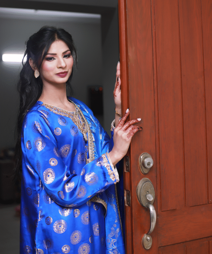 The deep royal blue base is adorned with delicately patterned golden circular motifs, giving the garment a regal appeal. The neckline is tastefully embellished with intricate golden zari embroidery and sequin detailing that add a subtle yet striking shine. Full-length sleeves and an easy, relaxed fit ensure all-day comfort without compromising on style. Complemented by traditional jewelry and light makeup, this kaftan promises to be a head-turner at any event.