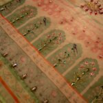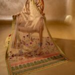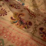 Dastan, “the teller of fables,” is a breathtaking pistachio green masterpiece. It vividly portrays dancing peacocks beneath Mughal trees, brought to life with an exquisite composition of sequins, bajra, aari taanka, and multicolor badla. A delicate lappa finish adds the perfect touch to this soft yet grand statement, a story meticulously stitched over 26 hours for a discerning few.