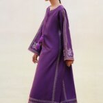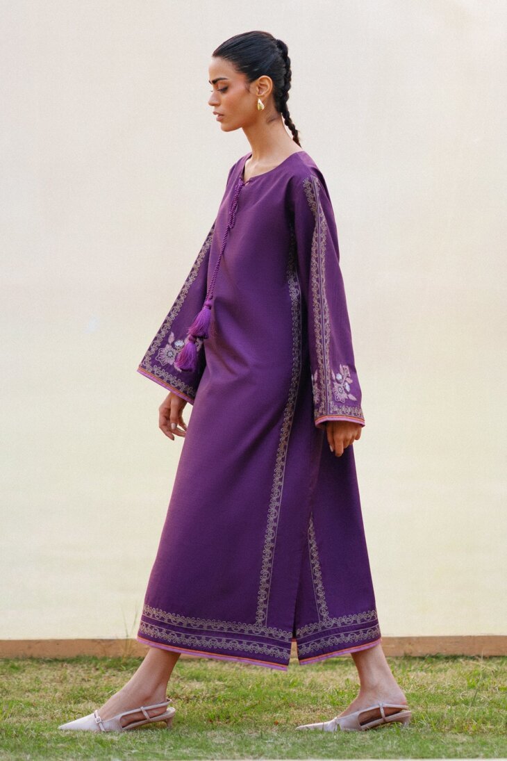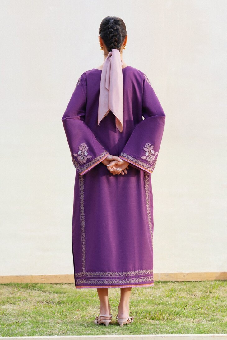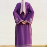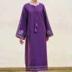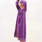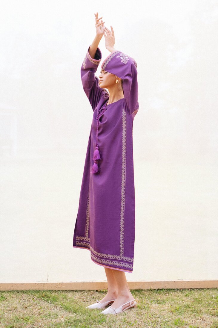A luxurious, long kaftan in a deep amethyst hue, featuring subtle golden thread embroidery along the hem and dramatic bell sleeves. Finished with statement tassel ties at the neckline, it’s an effortless blend of comfort and elegance.