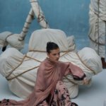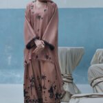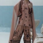 A sophisticated loose-cut kurta in pure raw silk (80 gms), featuring all-over screen-printed bunches and hand-embellished with cutdana, crystals, moti, sequins, and 3D flowers. The outfit includes a matching crepe silk farshi shalwar with screen print and handwork, and is finished with a lace-edged crinkle chiffon dupatta.