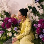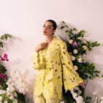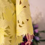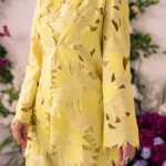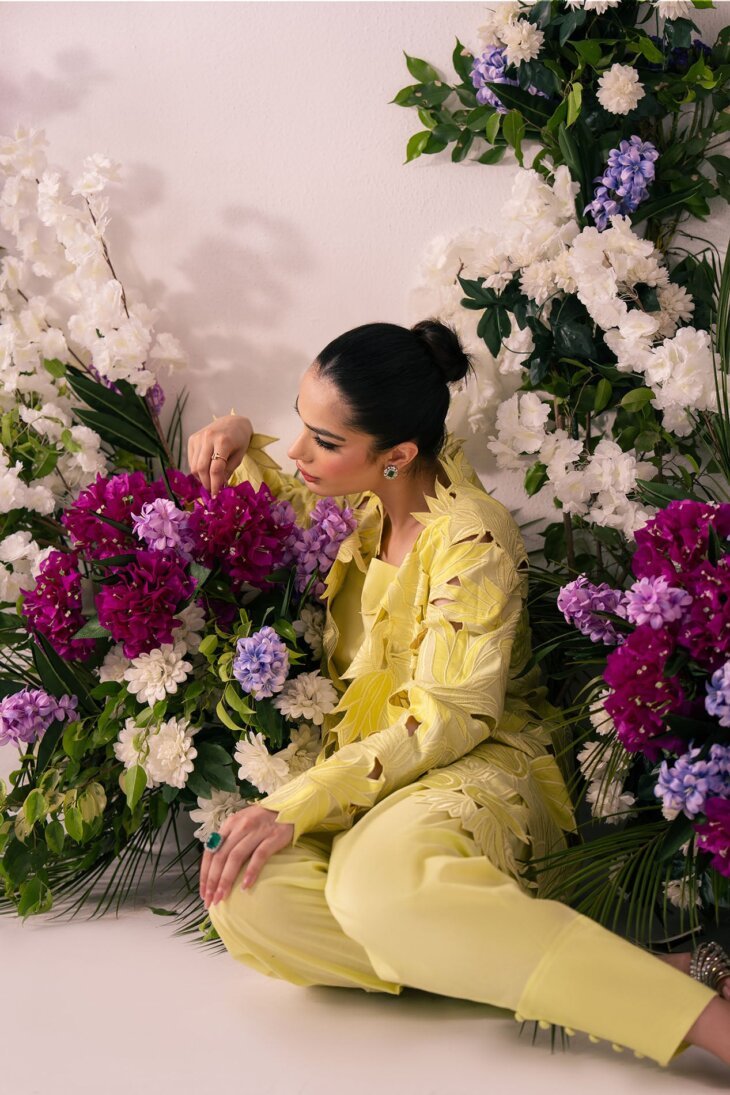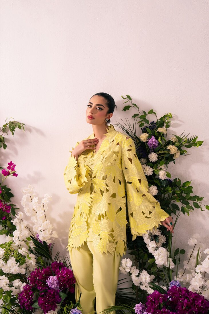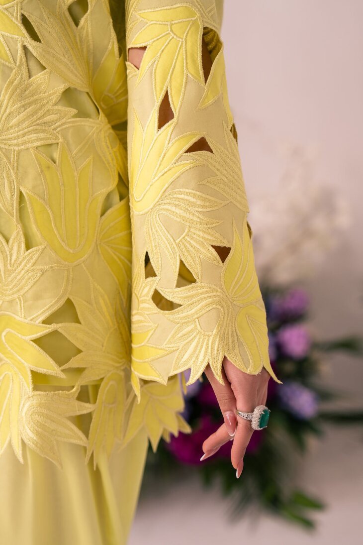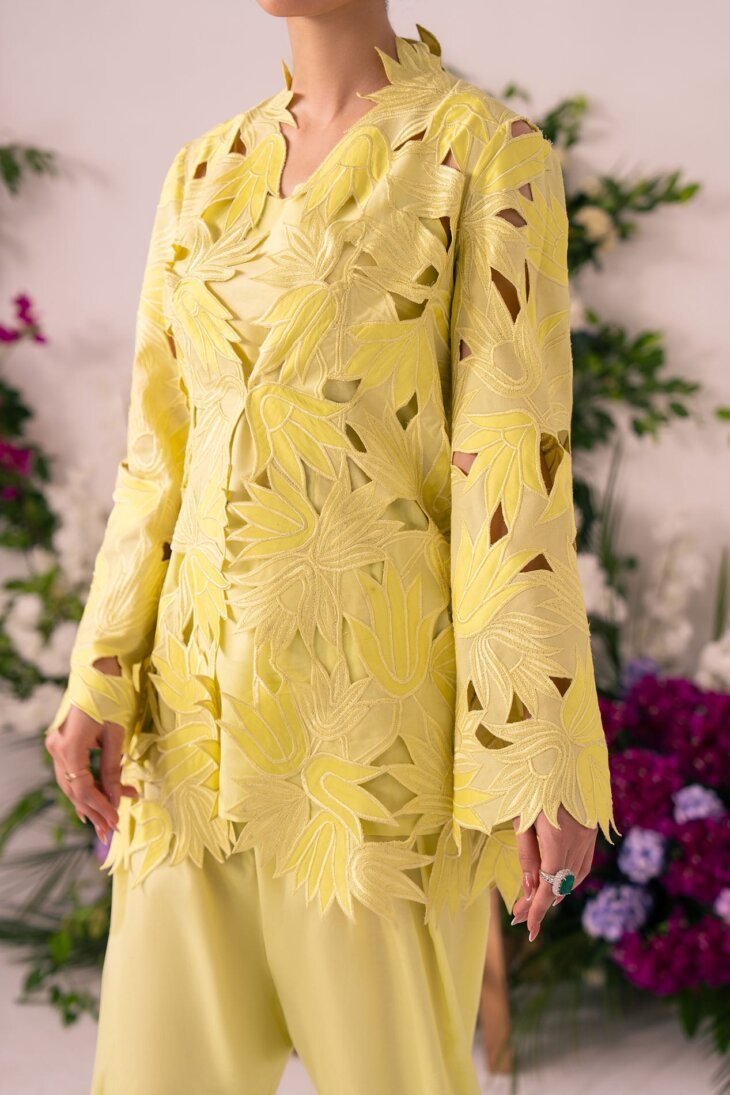This striking piece features a bright lemon-lime yellow color in a sophisticated two-piece look. The outer jacket is the highlight, with an intricate laser-cut floral and leaf pattern creating a beautiful three-dimensional texture. The sharp, structured collar and flared sleeves make it an elegant, statement-making outfit.