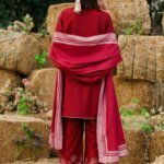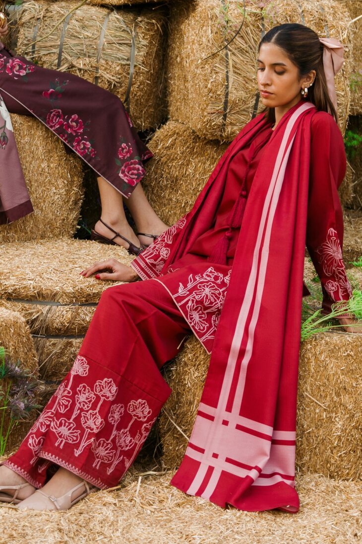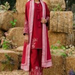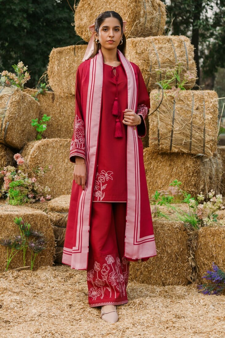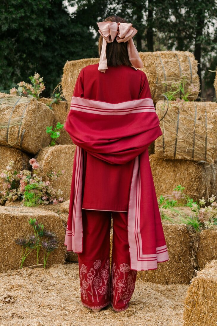 A stunning, monotone deep red ensemble featuring a sleeveless inner tunic, a long outer jacket/coat with white minimalist floral embroidery, and matching trousers with heavy outline embroidery at the cuff.