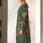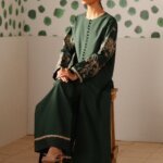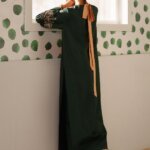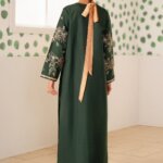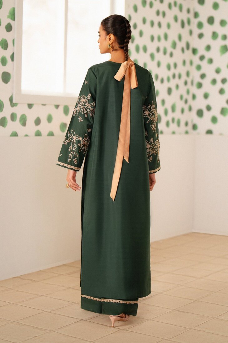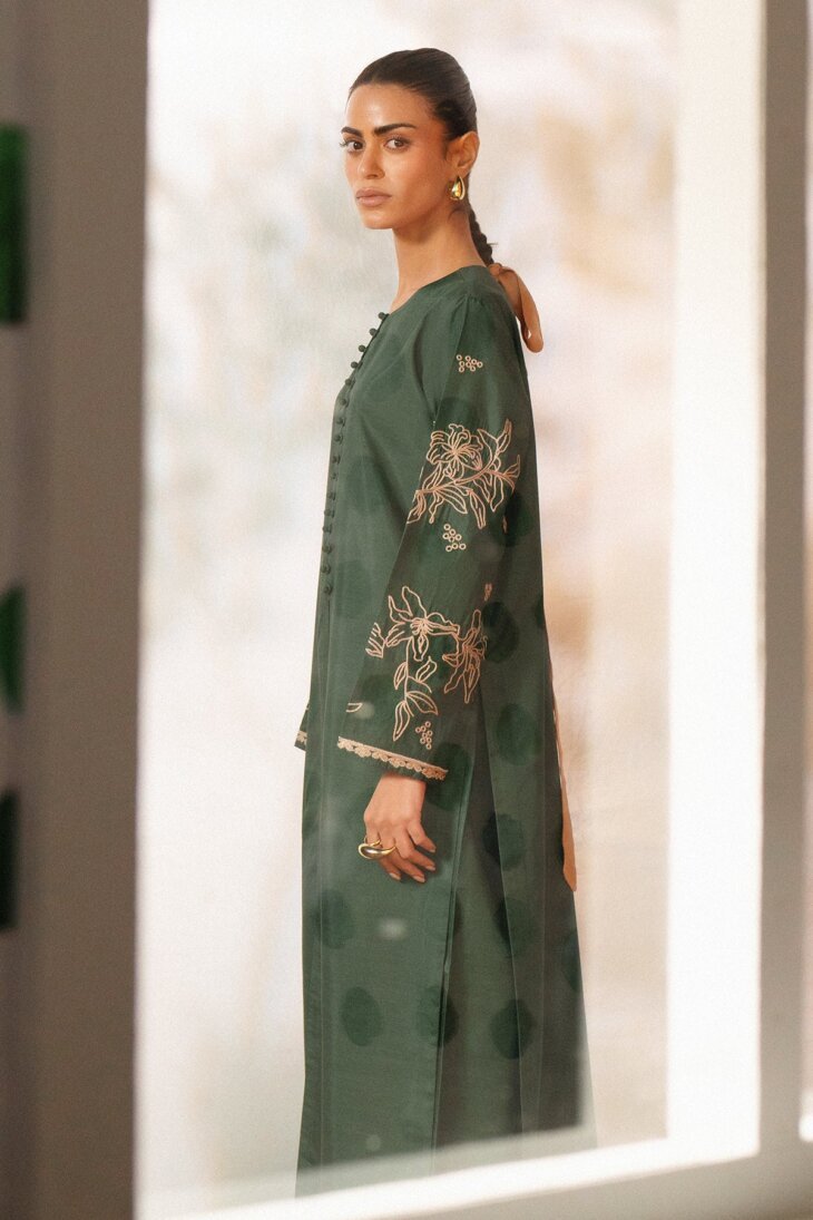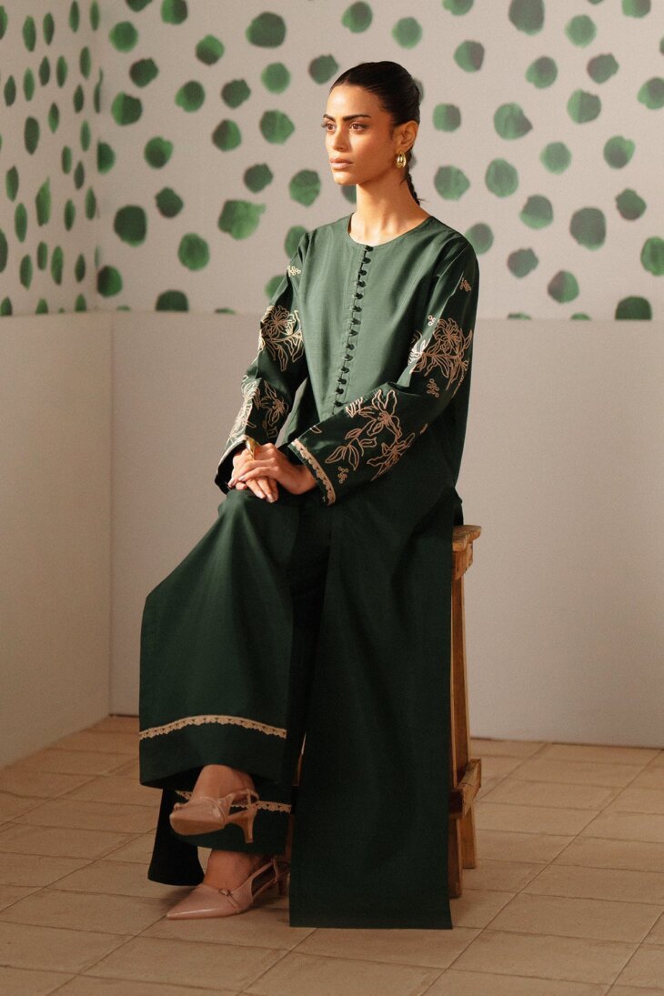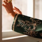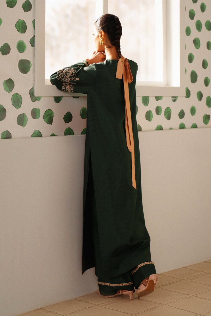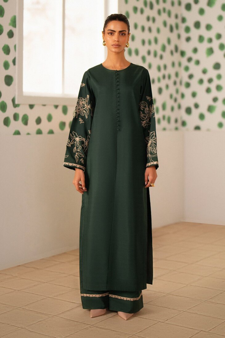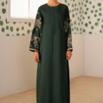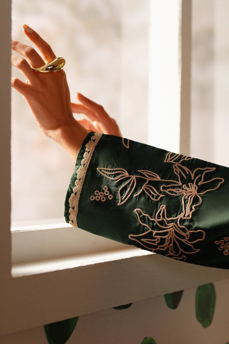 A classic, full-length straight-cut tunic in deep Emerald or Forest Green, featuring delicate gold outline-style floral embroidery on the statement sleeves and simple button detailing down the front.