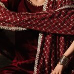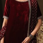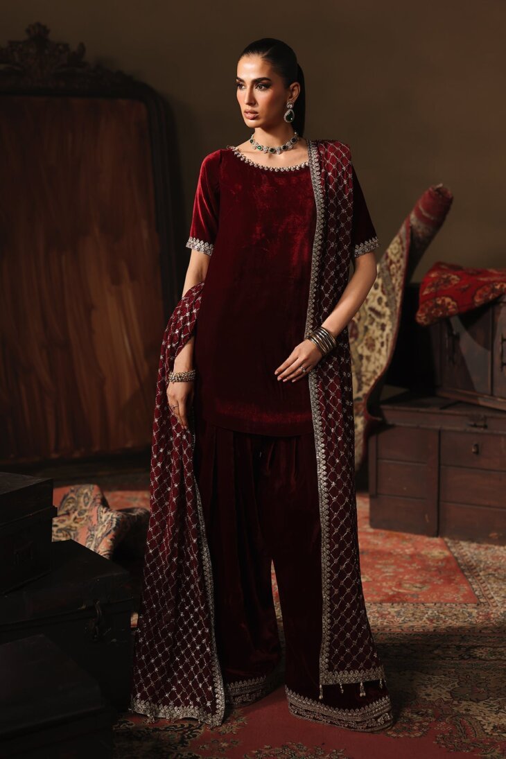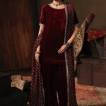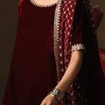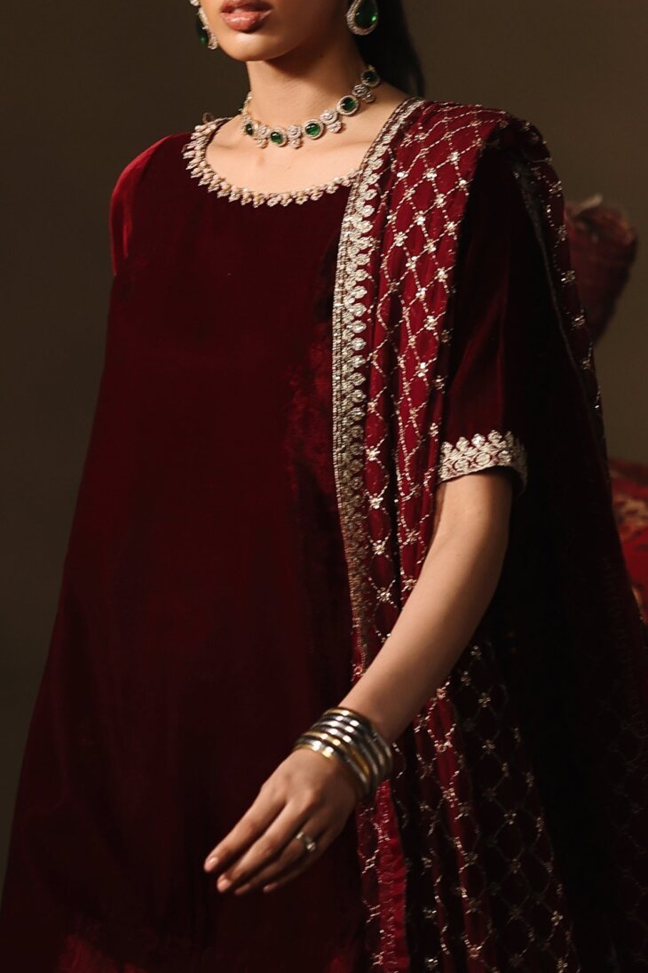 A breathtaking three-piece ensemble crafted from sumptuous merlot-red velvet. The simple tunic and chic shalwar-style trousers are beautifully contrasted by a heavy net shawl that features intricate silver and gold lattice embroidery. A regal and sophisticated look perfect for any grand celebration.
