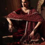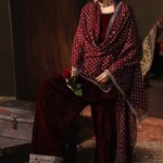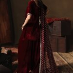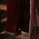 A matching maroon velvet farshi shalwar, generously flared for that classic, regal sweep. The hem is richly embellished with intricate embroidery, giving the outfit a traditional yet luxurious finish. The fall and volume of the farshi create a beautifully dramatic silhouette.