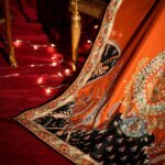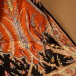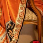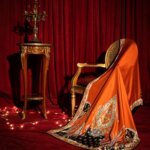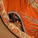 Gauhar is a striking piece in a bold naranji (orange) shade, featuring a powerful interplay between traditional Mughal florals and profound black and blue accents. The intricate bethi dabka and bakhiya taanka stitching create a rich, tactile surface that feels both ceremonial and commanding. Representing 25 hours of handcraftsmanship and made with 24 different artisan materia