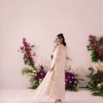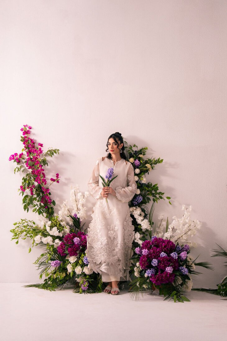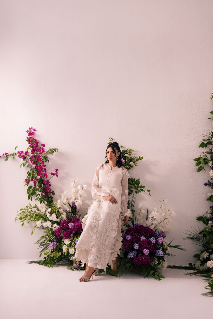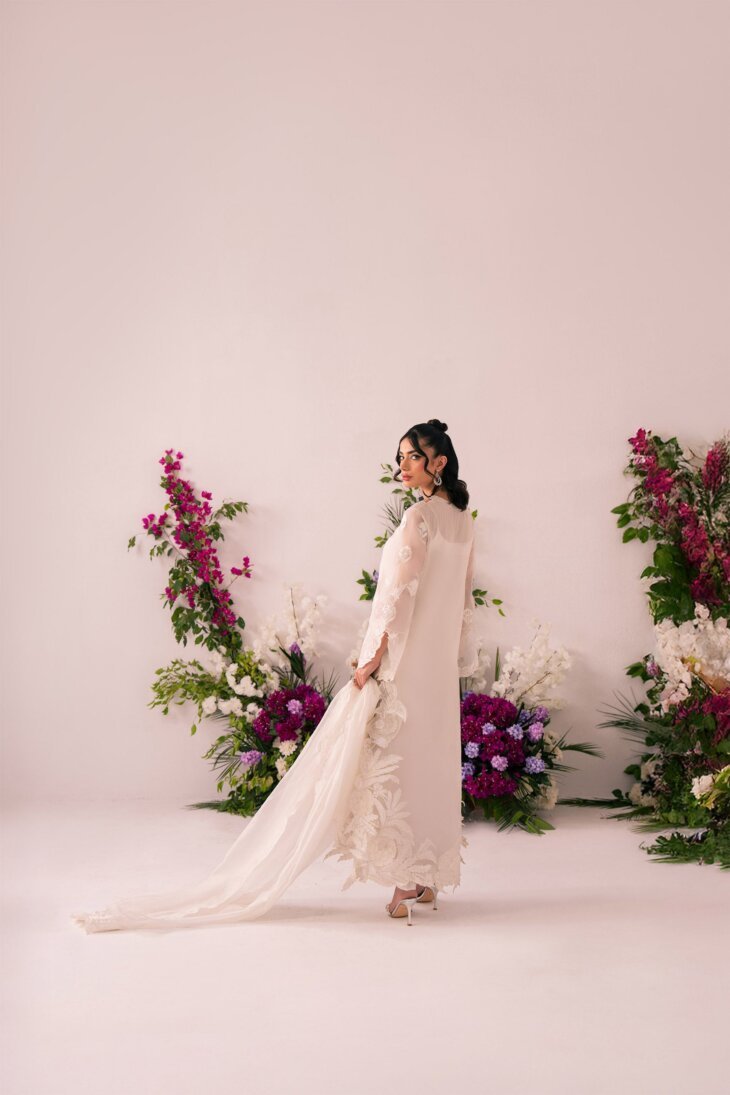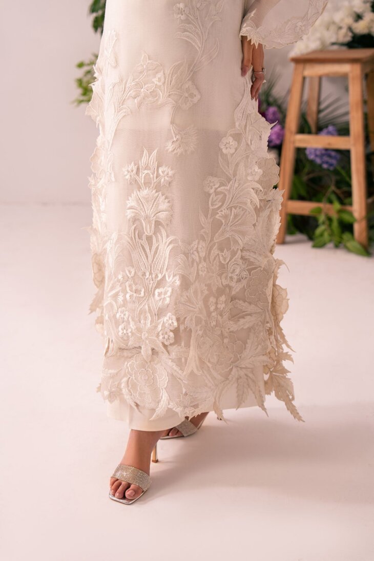 This exquisite garment is a luxurious ivory or off-white tunic featuring rich, three-dimensional cutwork and embroidery in a floral and vine motif. The sheer fabric and delicate beadwork along the neckline, combined with the cutout shoulder detail, give it an ethereal and sophisticated look, perfect for formal occasions.