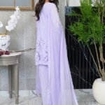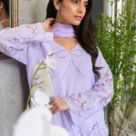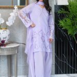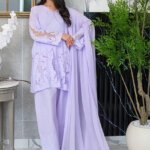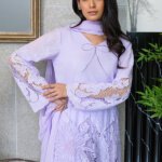 Drift into breezy elegance with our Lilac Dream Salwar Kameez. This three-piece set is your new go-to for effortless style. The soft lilac hue is adorned with intricate chickenkari embroidery on the shirt and sleeves, complemented by a delicate bow at the neckline. The flowing dupatta features floral embellishments along the borders, perfectly matching the chickenkari farshi shalwar bottoms. Crafted for comfort and style, this set is a breath of fresh air for your wardrobe.