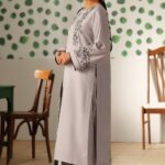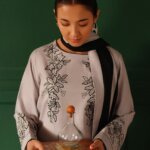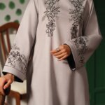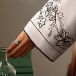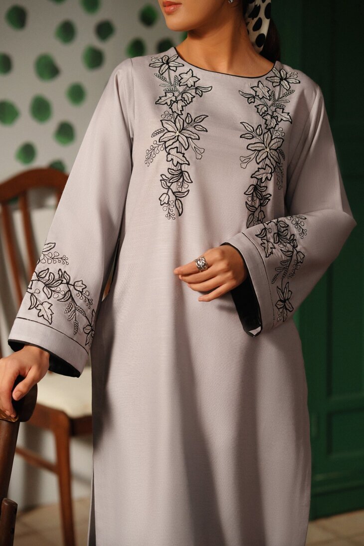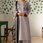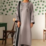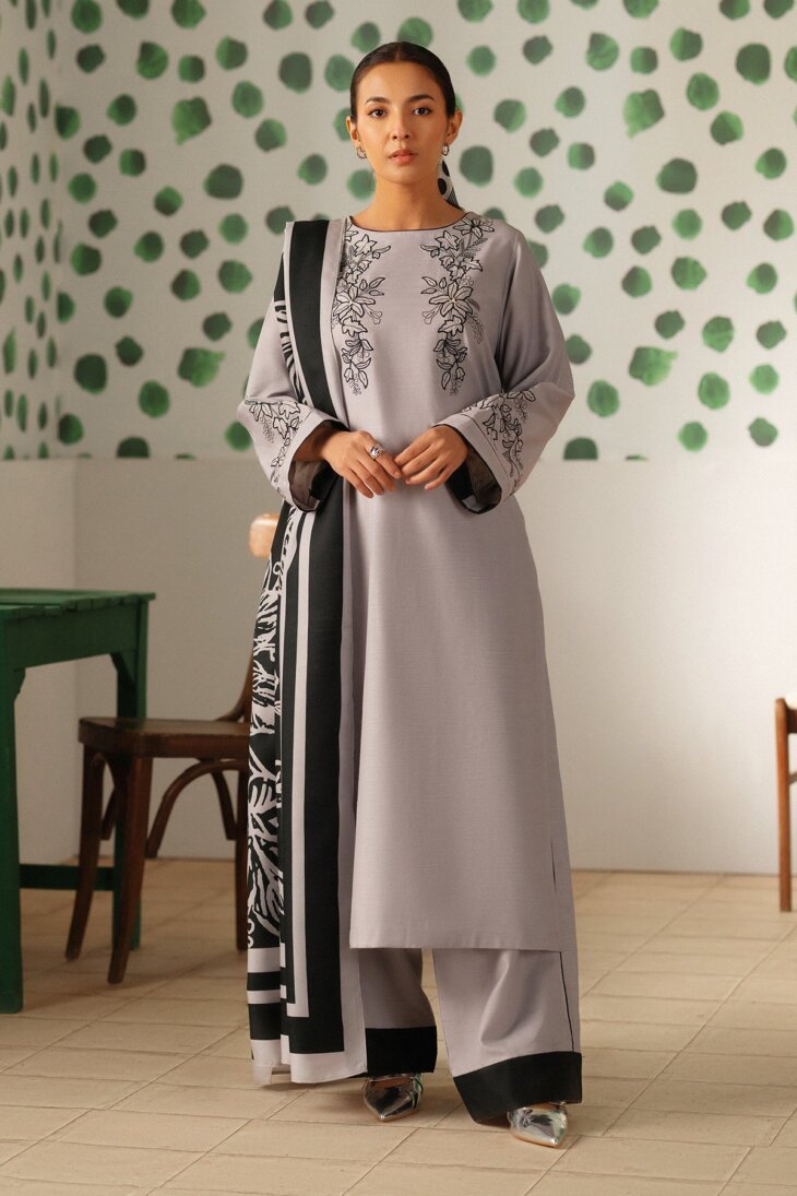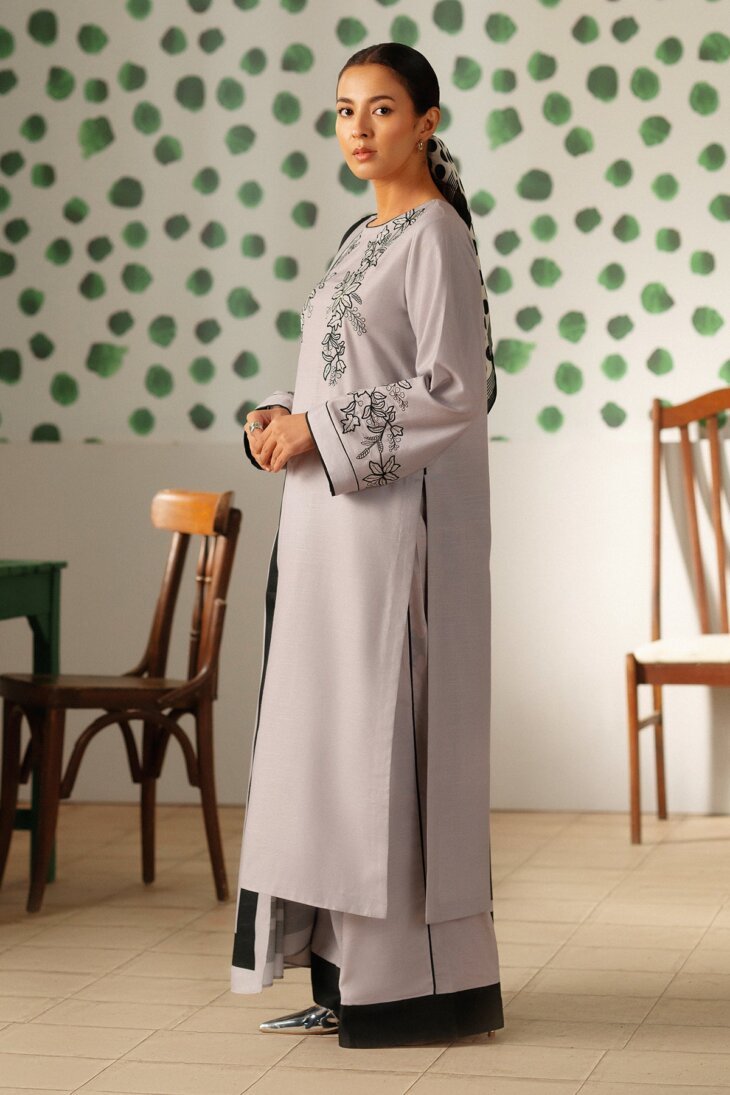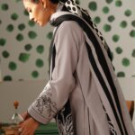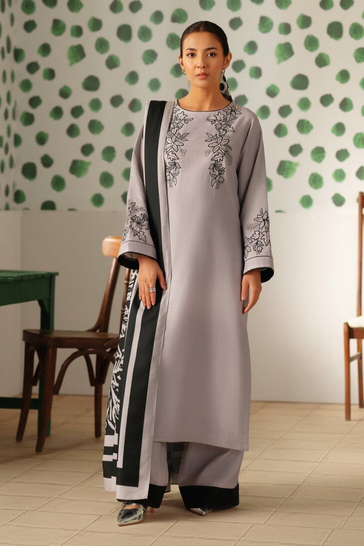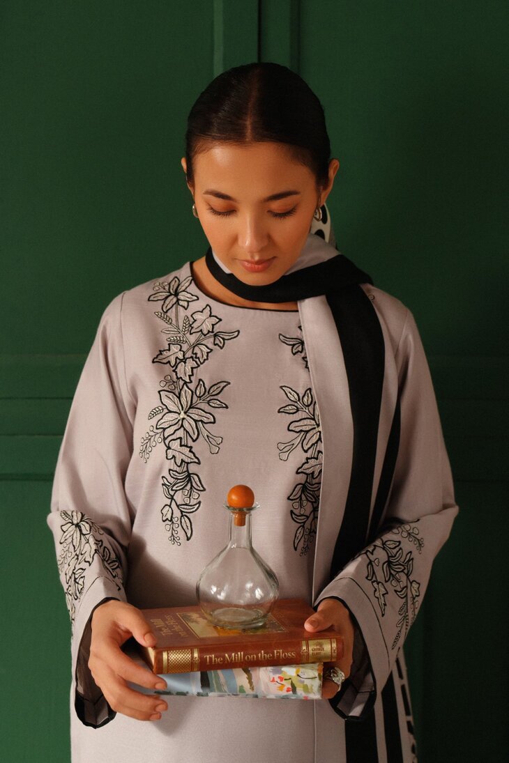A sophisticated, dove gray straight-cut Kurta featuring delicate charcoal floral embroidery on the yoke and cuffs, dramatically offset by a striking black and white graphic-print shawl/dupatta.