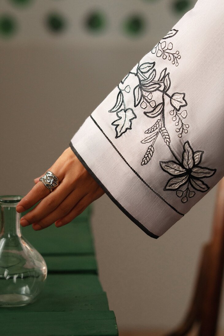 Pearl Grey Slub cotton embroidered long-length shirt with black binding.