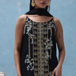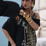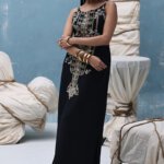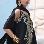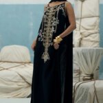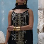 This black kaftan is crafted from pure raw silk and features a stunning blend of gold and silver zardozi embroidery. The intricate handwork includes kora, dabka, nakshi, cutdana, moti, tikki stones, gotta, and sequins. It comes with a matching dupatta, whose pallu is gracefully adorned with delicate crush crystals.