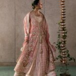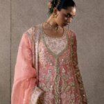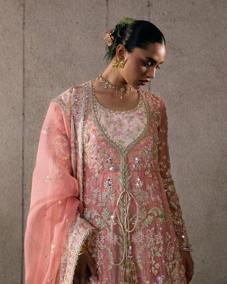 In a romantic blush rose hue, this four-piece design pairs a printed crushed pishwas with a heavily embroidered front-open organza jacket. Embellished with handwork in gold and silver, the overlay features tassel detailing at the front and a scooped V neckline framing the curved round neckline of the pishwas beneath. Full fitted sleeves with embroidery and tassels add refined elegance. Styled with matching printed sharara pants adorned with floral accents and detailed hems. The organza dupatta completes the look with printed borders that flow inward with delicate embroidery.
