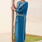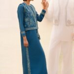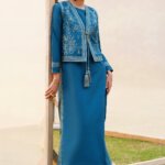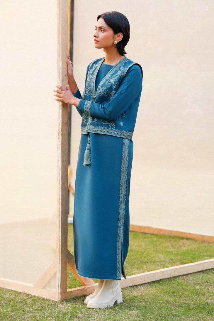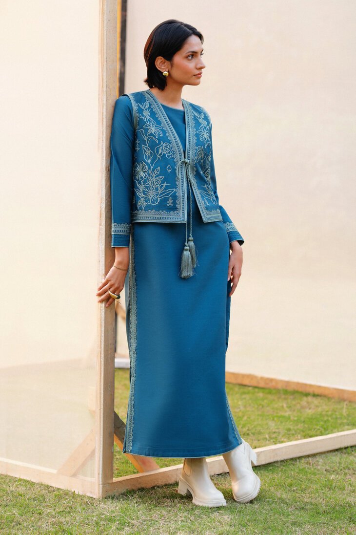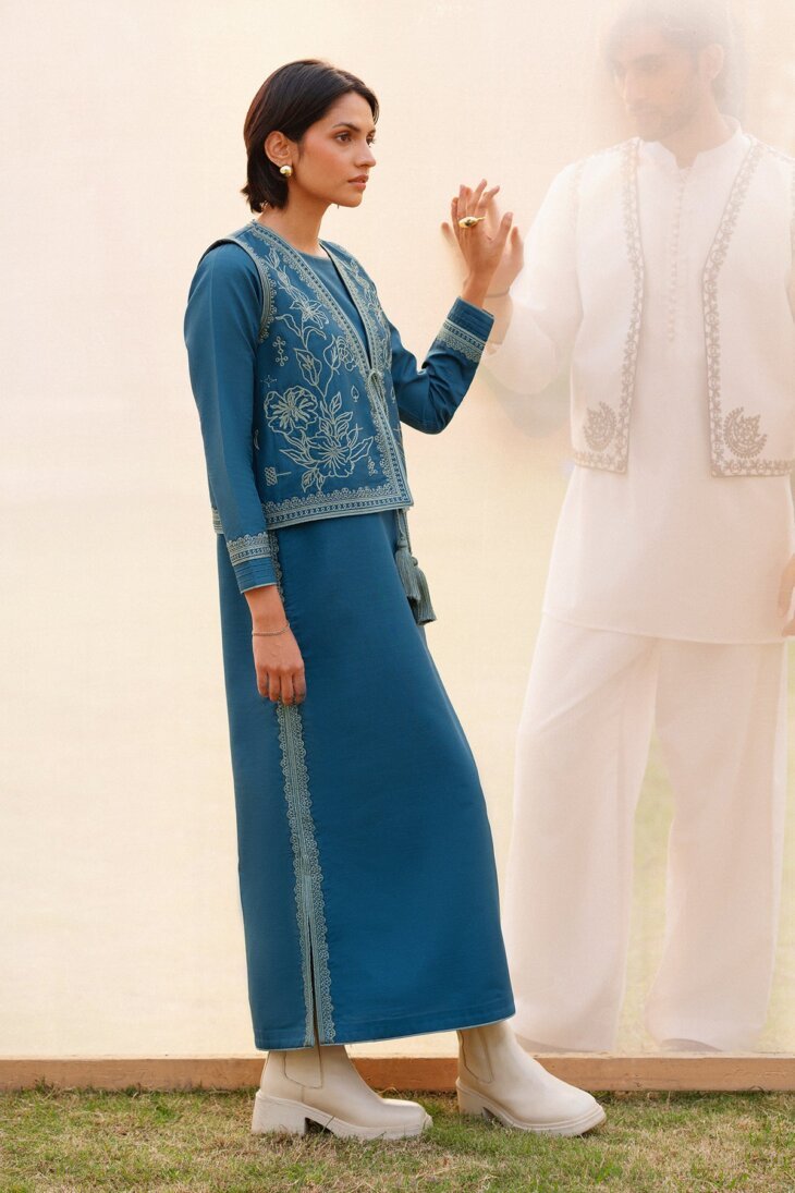 This stylish two-piece ensemble pairs a flattering, straight-cut maxi dress in a rich petrol blue with a structured, sleeveless jacket or waistcoat showcasing detailed floral and vine embroidery across the front and back.