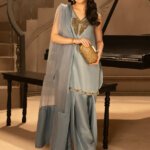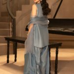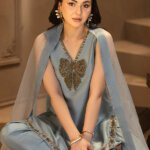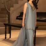 This elegant and charming outfit features a delicately embellished bow with golden nagina, adding a hint of opulence. It’s styled with a tailored farshi shalwar and a soft, pure organza dupatta, which brings balance and poise to the look. Perfect for festive gatherings, this ensemble combines quiet luxury with effortless style.