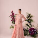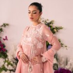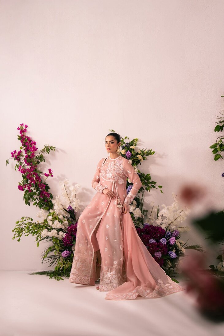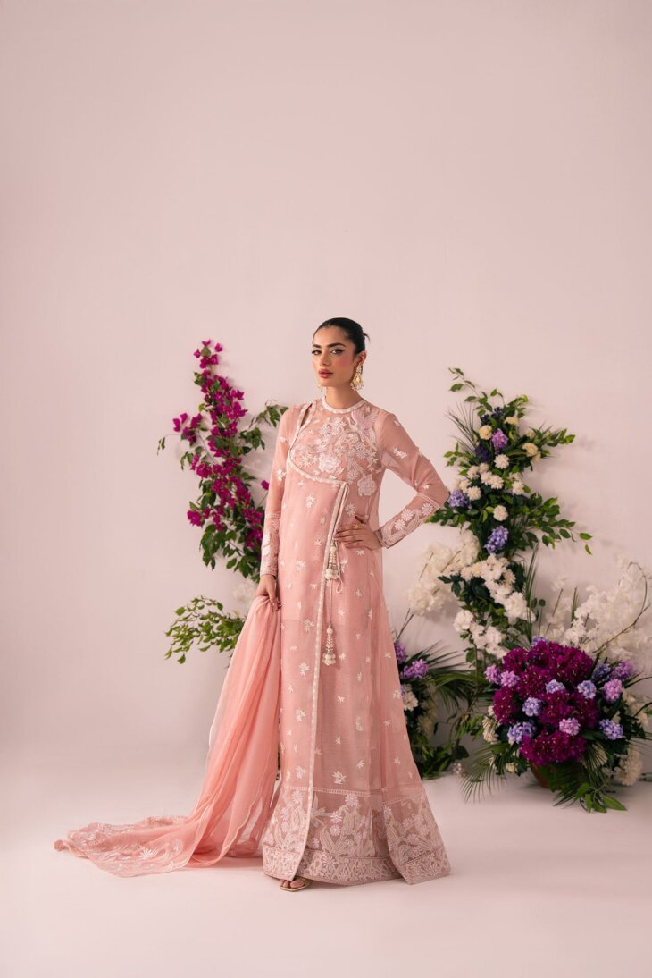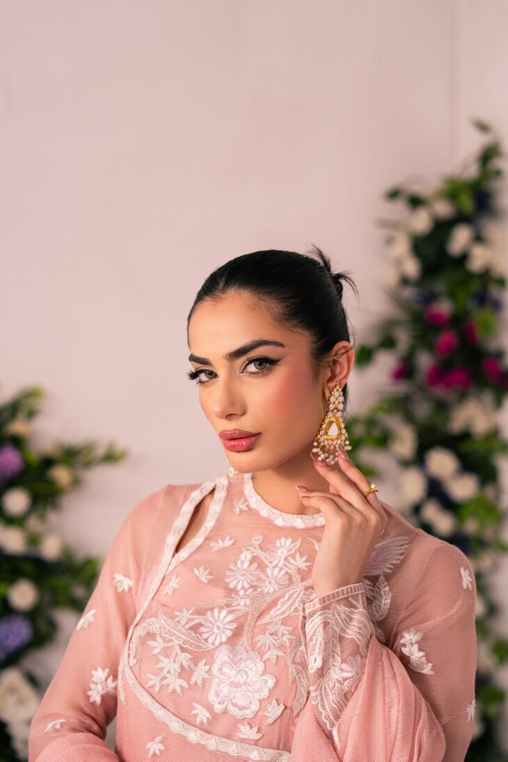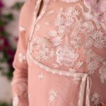 This elegant Pakistani or Indian-style Kurta in a soft pink shade is adorned with rich, contrasting white threadwork and finished with a traditional tie and tassel closure, perfect for formal events.