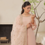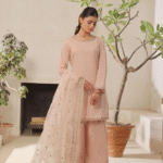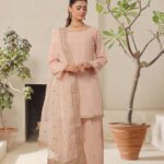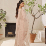 The set is completed with a sheer dupatta, embellished with delicate threadwork and a finely embroidered border, giving the outfit a graceful flow. Whether for festive gatherings, traditional functions, or elegant daytime events, this ensemble ensures a refined yet effortless look. Pair it with statement earrings and embellished footwear to complete the outfit.