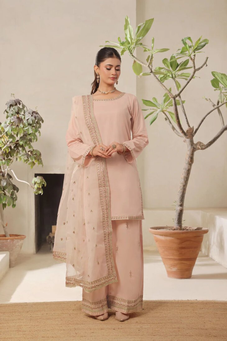 Elegant pastel pink embroidered palazzo suit featuring a straight-cut kurta with delicate embellishments, paired with flowy palazzo pants and a sheer dupatta adorned with intricate borders. Perfect for festive and semi-formal occasions.