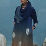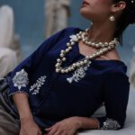 This elegant ensemble features a True Blue Charmeuse silk kaftan, a true statement piece. It’s adorned with ivory resham bunches and hand-embroidered details like tikki stones, moti, cutdana, and 3D patti work. Crystal hangings on the sleeves add a final touch of glamour. The outfit is completed with crepe silk pants and a pure medium silk scarf, which has a chic ombré pallu and crystal accents.