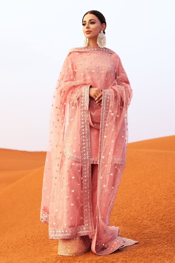 A striking, three-piece Sharara ensemble in a delicate, dusty rose or blush pink, fully embellished with shimmering mirror-work or sequins on the wide-border dupatta and the heavily detailed trouser cuffs.