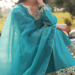 - Embellishments: Intricate lacework on the neckline, sleeve cuffs, and shirt hem, accented with hand-applied tilla embroidery and shimmering stone patches