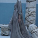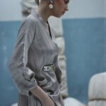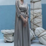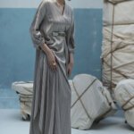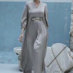 This contemporary silver grey crinkle silk kaftan features sophisticated gold and silver stripes. A bold box pleat and a standout leopard belt define its shape, while crepe silk pants complete the sleek, modern aesthetic